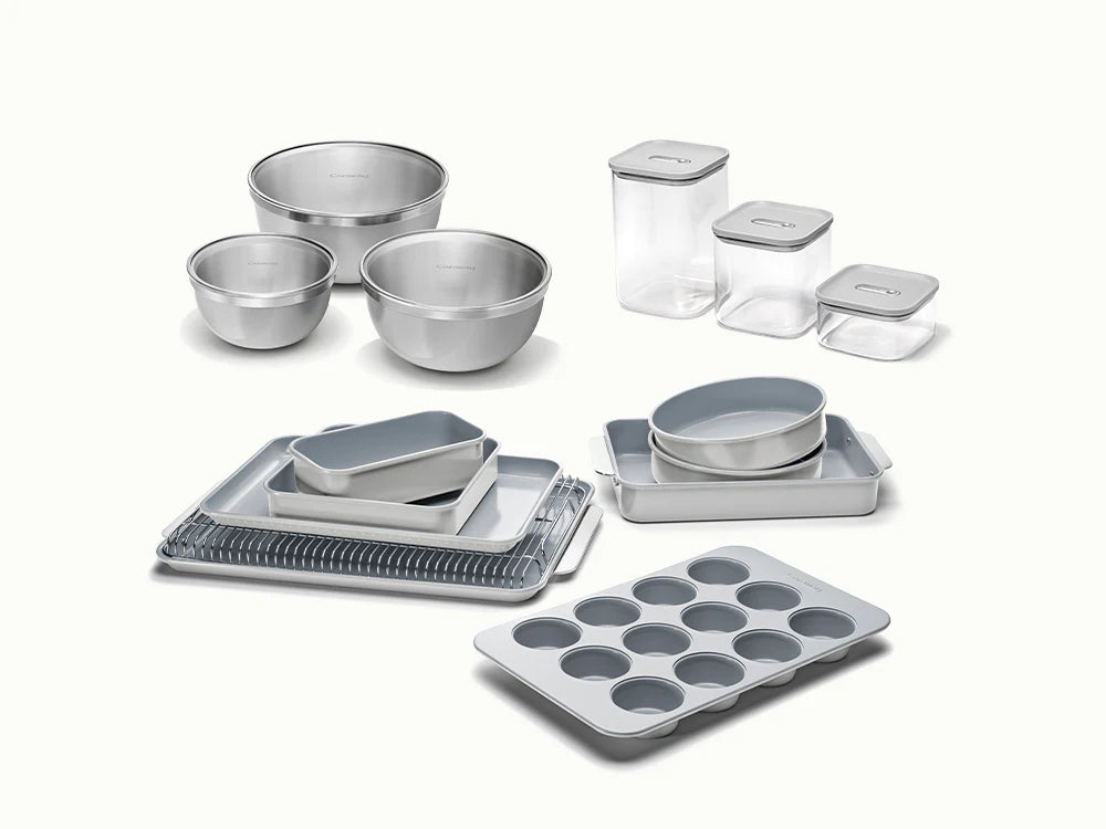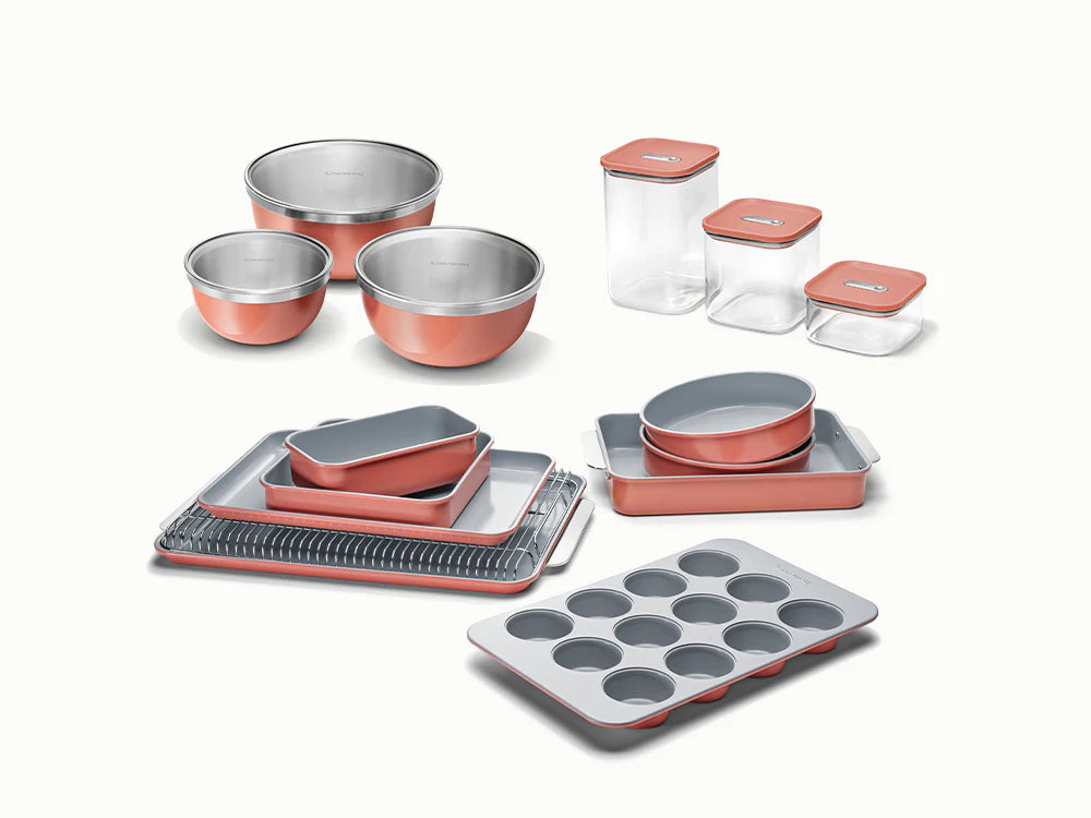 Level-up your baking routine with Caraway’s Better Baking Bundle. Glass Airtight Containers stack neatly and keep your go-to ingredients fresh, while Stainless Steel Mixing Bowls bring durability and ease to batters, frosting, bread dough, and more. Our full line of Ceramic-Coated Bakeware brings your recipes to life—from sweet treats to savory classics.