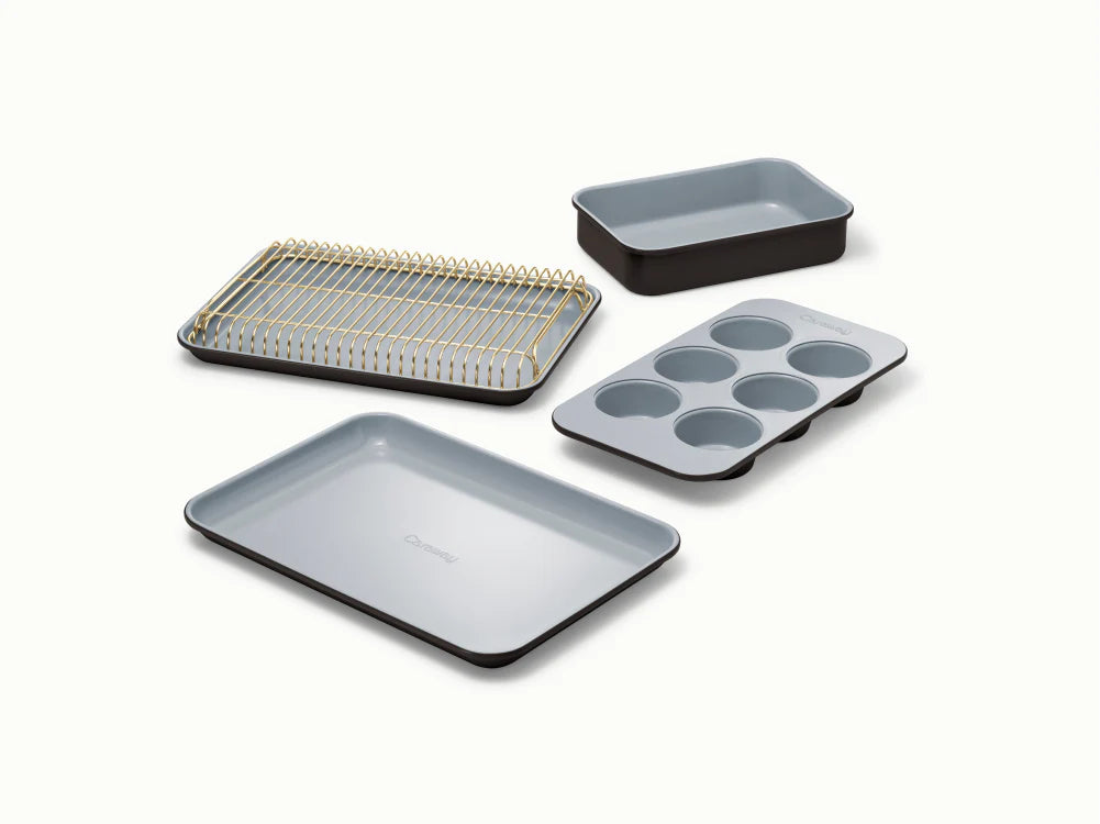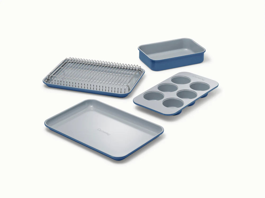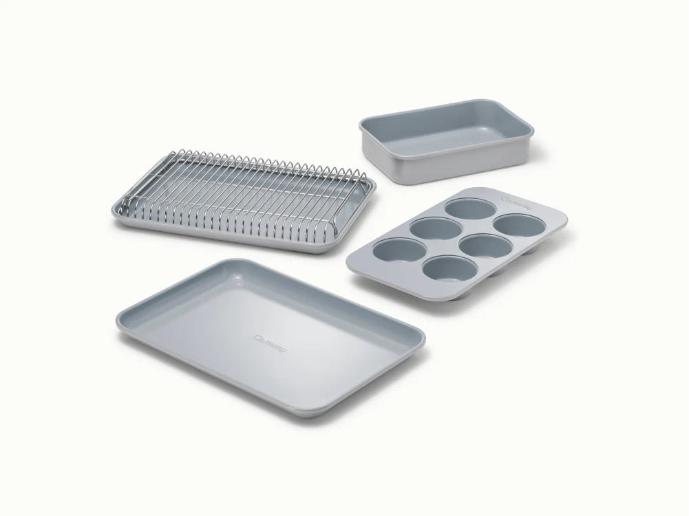 Bake smarter with the Caraway Mini Bakeware Set—non-toxic, ceramic-coated, and crafted for compact kitchens and small spaces. Offering effortless non-stick performance and easy food release, this durable set is oven-safe up to 550ºF and versatile enough for baking, roasting, and meal prep—all bundled together in a first-of-its-kind, space-saving Storage Organizer.